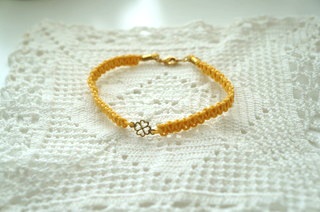 イエローのコードで平結びという結び方をし、トップに四つ葉のクローバーのモチーフをつけたブレスレットです。
