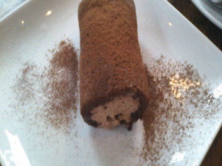 私は「ちょこちっぷ」、友達のほうは麩の入ったもの。生地は抹茶です。洋風のロールケーキに 和風の麩が入った、珍しいケーキですね。(今度は私もこれ食べようかな)