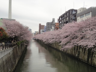 | 上の地図の右下が、今回のスタートです。下流域は目黒川の川幅も大きく、桜も豪快に見えます。 | 本当にちょうど満開でした。 |