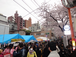 | 人出はこんな感じです。露店がいっぱい出ています。 | 川辺の桜はいい感じです。これで晴れていたら最高でしょうね。 |