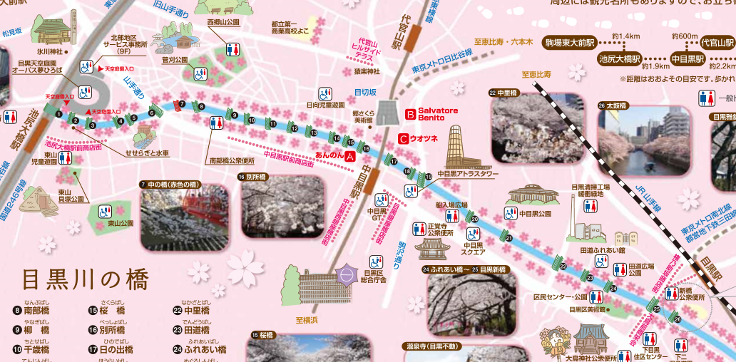 | 池尻大橋まで、25個の橋が架かっています。 橋の上からの桜は見ごたえありますね。 |