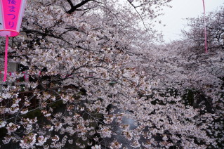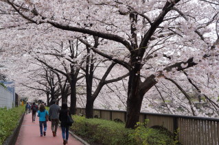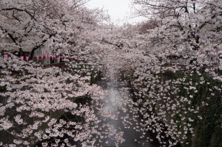 | JR目黒駅を下車して目黒川までやってきました。左半分は満開のようです、左は6−7咲きでしょうか。 | 満開側を歩きました、いやーいいですね、桜のトンネルです。 |