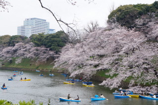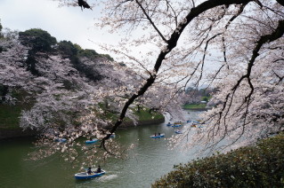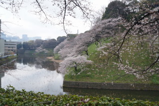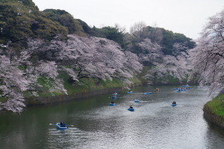 | こちらは、九段下の駅を上がったところで、千鳥ヶ淵の反対側の濠になります。こちらもきれいですね。 | そして、武道館の入り口を過ぎて、千鳥ヶ淵にやってきました。テレビで見る、あのボートと桜の風景です。 |