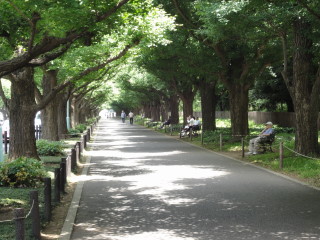 | 青山通りから外苑のイチョウ並木に入っていきます。ここには外苑の歴史が刻まれた石碑があります。 | イチョウ並木。本当にゆっくりした雰囲気がとっても良いですね。 |