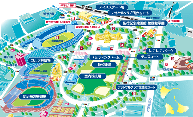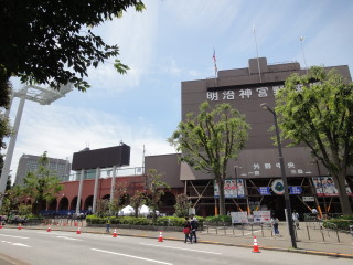 | 神宮球場。言わずと知れた東京ヤクルトスワローズのホーム球場。この日もデイゲームがあり、多くの人が列を作っていました。 | こちらは、国立競技場。今は工事中。2020年の東京オリンピックが楽しみです。 |