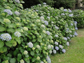 | 庭園から洋館のベランダを望む。 | 庭園の端にはアジサイの花が咲き始めていました。 |