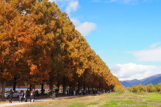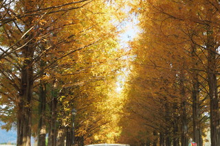 滋賀県の北部、高島市のマキノ高原に向かう道沿い2.4kmに渡りメタセコイア500本の並木が続きます。まるで、金色に輝く並木は、夏、冬にも訪れたくなる美しい場所です。