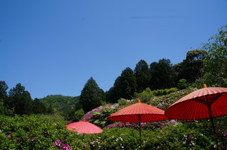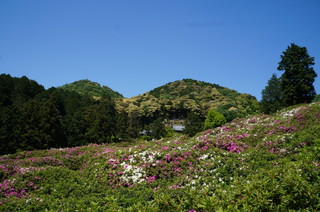 | この三室戸寺は、ツツジ2万本が見頃を迎えてました。一面のツツジは本当に綺麗です。 | ツツジの奥には本堂が見え、さらに奥には新緑の山に青空と、ナイスな場所でした。 |