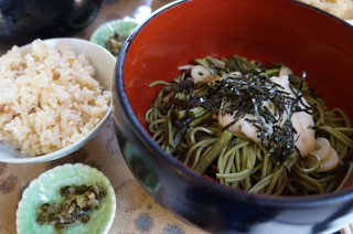 | 庭園内の茶店でお昼としました。 茶そばセット 1000円 |
