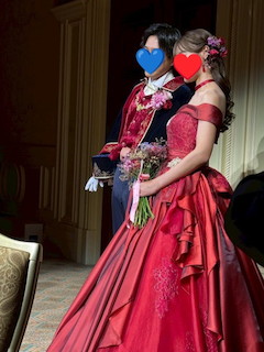 純白のウェディングドレスから、真っ赤なドレスへ。新婦の服装についてはいつもあまり意見を言わない新郎が、このドレスを試着したときには「かわいい」と言ってくれたので、このドレスに決めたのだそう。とっても似合っていて素敵でした。 |