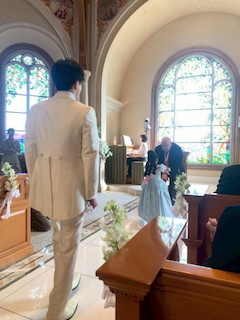 結婚指輪をそっと両手で持って、新郎の少し先を進み、メイヤーにしっかりと手渡しました。