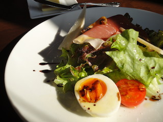 お野菜のトップに君臨している生ハムとその両サイドにスライスされたチーズ。(筍に見えたんですけどチーズでした・笑)手前にあるゆでたまごもとろっとした半熟で、おいしかったです。オリーブオイルがたっぷりかかったヘルシーなサラダです。お箸でいただけるのもうれしい♪フォークだと最後に残ったレタス一枚が食べにくかったりしますよね〜 |