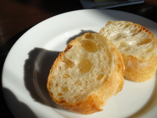 手でちぎろうとすると「パリパリ」と音がしてパンの粉が飛ぶくらいのパリっと感。噛み応えがありました。でも噛めば噛むほどおいしいんです♪ひと切れはバターを乗せて、もうひと切れはあとで運ばれてくるハンバーグのデミグラスソースをつけていただきました♪ |