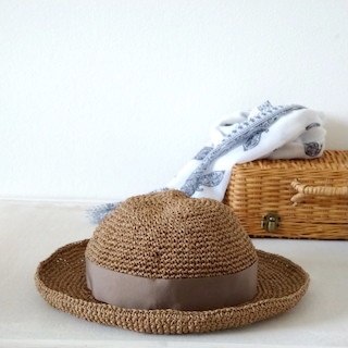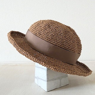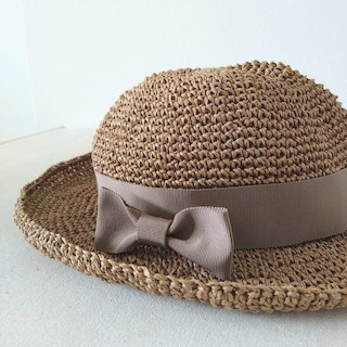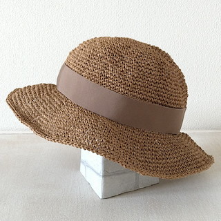 ブリムの端にテクノロートというプラスチックのワイヤーを編みくるみました。ブリムをクルンと上向きにしたり、下に向けてしっかり日除けをしたり、2wayで楽しめます。