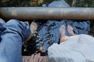 途中、足湯のコーナーがありました。さすがに長島温泉です。あったかくて、足湯から出た後もポカポカでした。タオルも売っていますし、足乾かし場所もあります。 (写真の足は夫と次女) |