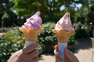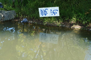 | ベコニアガーデン内で、ソフトクリームも食べました。それも赤いバラのソフトクリームと、ベコニアのソフトクリーム。バラの香りはわかるのですが、ベゴニアは食べたことがないので「こんな味なのかなぁ・・・」という感じです。どちらもおいしかったですよ。 ほかに黄バラのソフトクリームやチューリップのソフトクリームもありました。 ベコニアガーデンを出たところに面白い池がありました。看板にはなにやら不思議な文字が・・・。水に映すと「鏡池」とちゃんと読めますよね。 |