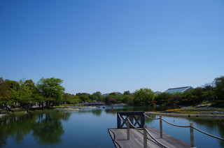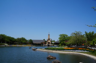 | 園内の中心には池があり、その向こうに見えるのはチャペル。青空に映える水辺の花がきれいです。 |