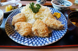 | なばなの里の園内には、多くのレストランがあります。中華に、フランス料理に、イタリアンに、日本料理に・・。今日は、その中でもトンカツ屋さん「かつ〇」(かつまる)に入りました。ヒレかつやロースかつに、ごはん、お吸い物、お漬物、デザート(メロンシャーベット)がついて1500円ほどです。ボリューム満点で、おいしくいただきました。(写真はヒレカツのセットです) | |