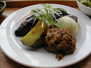 玄米ごはん・お味噌汁・サラダ・お漬物・メインはナッツ入りカレ−ペ−スト添えの野菜たち。ナス・かぶ・ジャガイモ・レンコンサツマイモを茹でたり軽くソテ−してあります。そのまま食べてもペ−ストをつけてもGOOD!お味噌汁の中にも無農薬野菜がいっぱい。