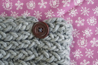 一部分をギュッと毛糸で縛ってへこませて、そこにつけた大きなボタンがポイントになっています。