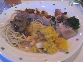 鶏もものグリル ポリネシアンソース、シェフの自慢の一品(鯛の焼いたもので上にハーブやピクルスのきざんだものが乗っていました)、和風きのこパスタ、パエリアです。