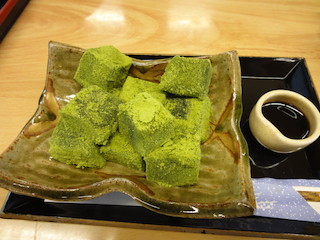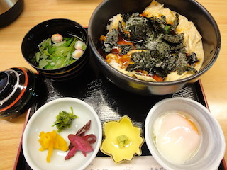 | 仁和寺の境内にある御室会館 「京料理 梵」で、「ゆば丼」850円をいただきました。甘辛いたれのかかった丼。初めて食べる味でした。大きな湯葉がド〜ンと乗っていて食べ応え満点! | デザートには、抹茶のわらび餅 540円。 抹茶がかかったわらび餅にたっぷり黒蜜をかける京都風の味がおいしかったです。 |