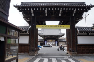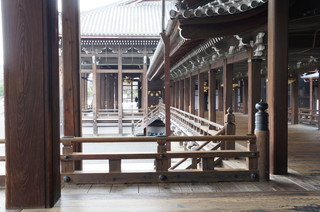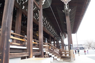| これは阿弥陀堂。1760年に再建される。 | 阿弥陀堂から、御影堂への廊下。この廊下が非常に趣があり良かったです。御影堂は、世界最大級の木造建造物で、1636年に再建されました。 |