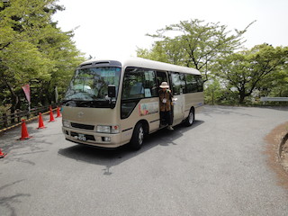 | 「小谷・江のふるさと館」 ステージでは、三姉妹、浅井長政にふんしたステージが見られます。 | いよいよ、小谷城址へ。 小谷城は、標高495mの小谷山に建てられた山城であり、浅井家の居城として有名。この小谷城は日本五大山城に数えられるほどの自然の要塞となっており、当時の様子を良く残した城跡と言えます。 このバスで途中の山腹(番所跡)まで行けます。(往復500円)、その跡は、本丸まで50mの標高を登ることになります。距離にして500mほど。しかし、かなり険しい山道です。 |