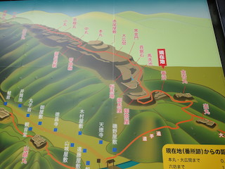 | これが、小谷城の全容です。その巨大さが分かります。さぞ、攻めづらい山城だったことでしょう。 | 途中の登山道は、こんな感じです。しかし、当時のまま残されており、戦国時代の雰囲気が伝わってきます。 |