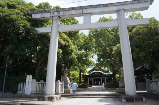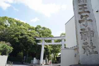 | JR王寺駅から王子神社に向かう途中は、このような小川が整備されています。涼しげです。 | 王子神社で、この土地の由来となった若一王子が起源とされています。 |