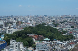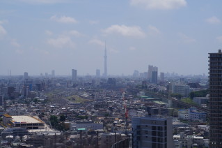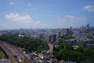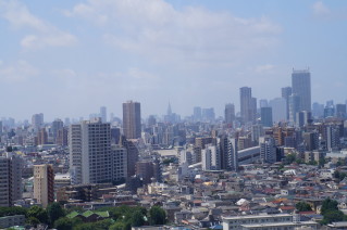 | JR王子駅のすぐそばにある、北区の庁舎、 北とぴあの17階 展望ロビーに上がりました。真下には、先ほどの飛鳥山公園とJR王寺駅が見えます。 | 新宿池袋方面、サンシャインビルなどビル群が見えます。 |