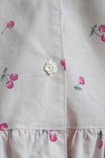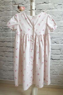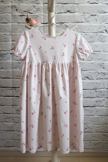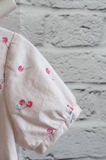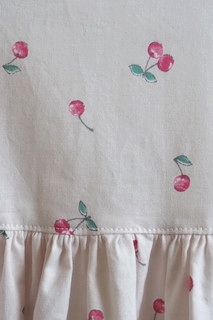 さくらんぼがプリントされたキュートな布で、ギャザーがたっぷり入ったふんわりシルエットのワンピースです。