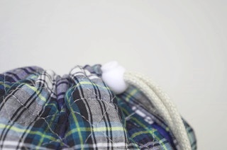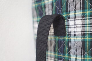 ネイビー系のチェック柄のキルティング布を、ナイロン製のバッグとだいたい同じくらいに裁断し、