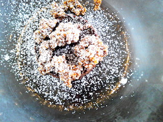 写真の撮り方が悪くて「何の写真?」って感じですね(汗)すみません。丸いチョコのテリーヌの上にナッツがいっぱい乗った図です。
