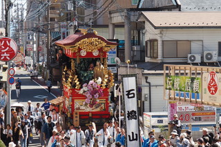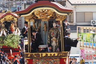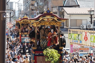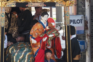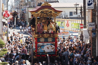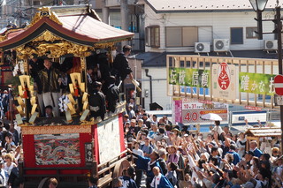 決められたスポーットで曳山が停まり、からくり人形によるショートストーリーが繰り広げられます。群衆からは拍手喝采が起こり、曳山の上から厄除けの粽や手ぬぐいが投げられます。それをなんとかゲットしようと人々が手を伸ばします。
