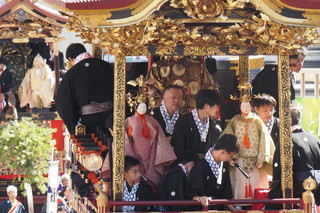 豪華絢爛な曳山の上には、おそろいの法被に身を包み楽器を打ち鳴らす大人や子供、そして精巧な造りのからくり人形が乗っています。