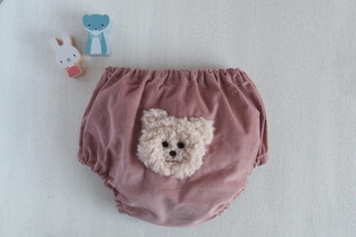 そんなポーズの時に見えたらかわいいかなと思って、お尻の部分にわんこのような、おさるさんのような、くまさんをアップリケしました。(くまさんに見えないという声もあるかもですが)