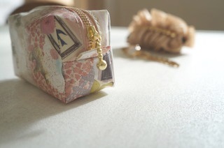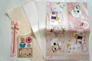 ピンク系デザインペーパー、綿の生地(生成り)、ペーパーラミネーる・両面粘着シート(白)、ペーパーラミネーる・コーティングシート(半透明)、ファスナー、コラージュ用シール(今回シールは使いませんでした)。
