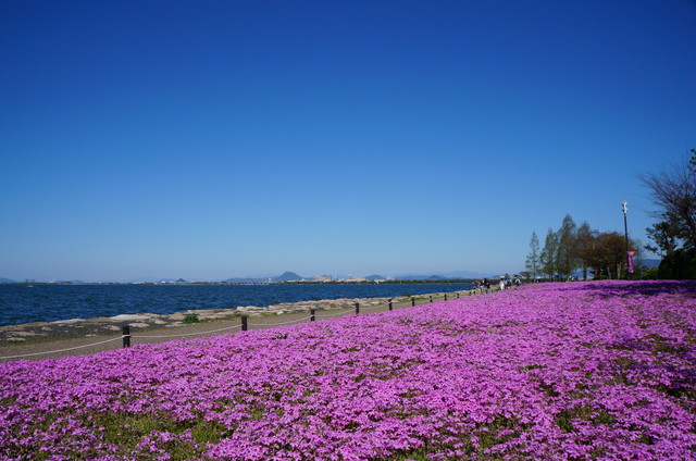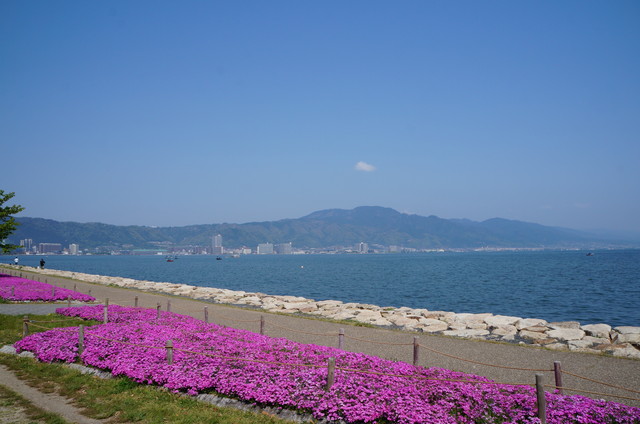 青空と、青い湖と、そして、芝桜、この色のバランスがとても美しい。 琵琶湖湖岸に毎年訪れる春の景色です。