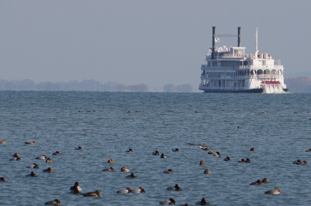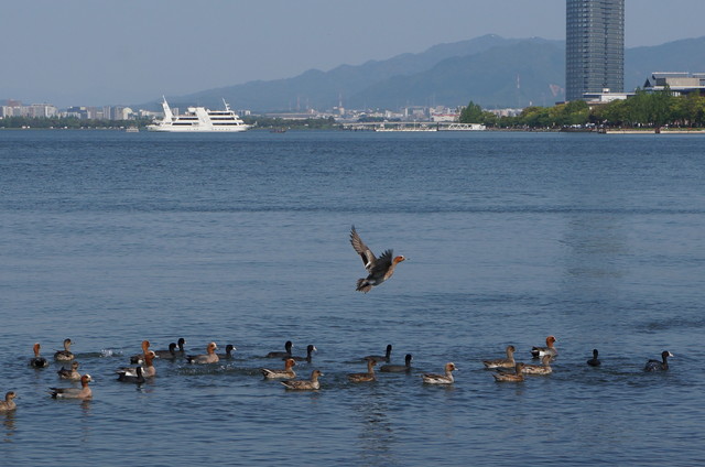 琵琶湖は水鳥の宝庫です。コガモに、カイツブリ・・・そして遊覧船のミシガン。