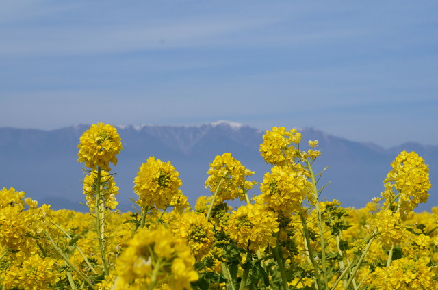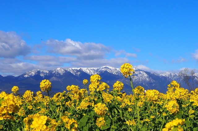 菜の花の奥、比良山には残雪が。春はすぐそこまでやって来てます。