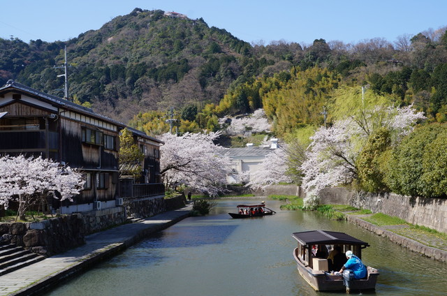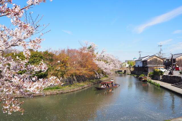 春の午後。八幡堀りの船頭さん、堀を流れる桜の花びら、ゆっくり流れる春の時間でした。
