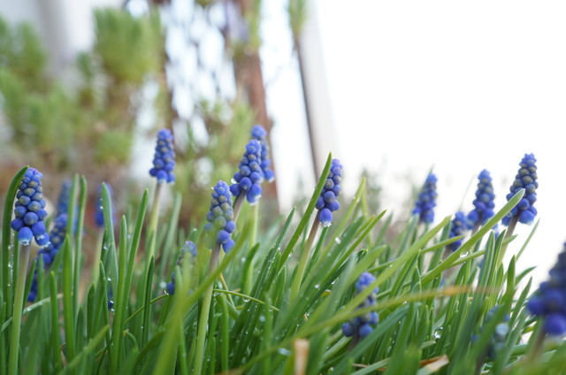 小さな丸が集まって咲いているムスカリの花と、玉のようなしずくが、春の気持ちのよい朝を演出してくれます。