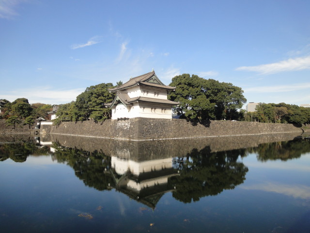| 濠に映る巽櫓。鏡のように移りこむさまは、異次元のようです。 |