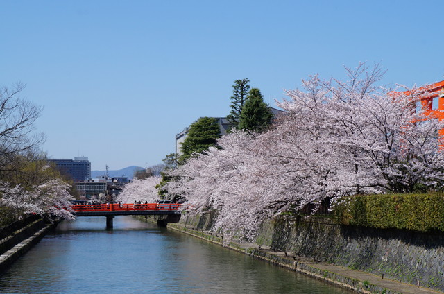 正面に見える赤い橋を渡ると、右手にちらりと見えている大きな鳥居の平安神宮です。古都・京都にやってきた春の景色です。