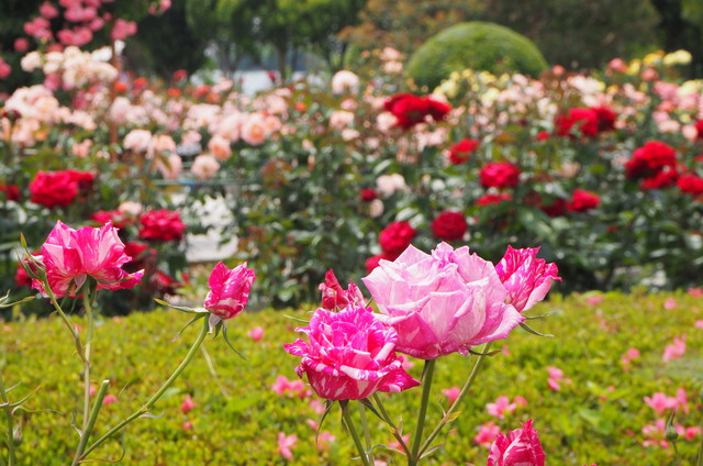 もう夏のような陽射しの中で、咲き誇るバラたち。こころ踊り、ワクワクする気持ちになります。