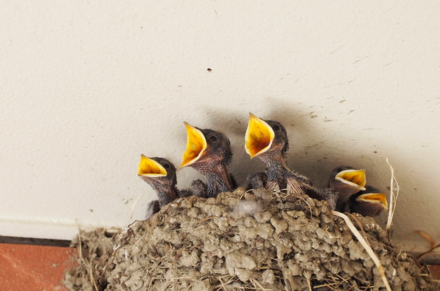 生まれて間もない、まだ羽も生えそろっていないツバメのひなたち。