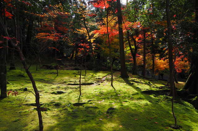 歴史感じる緑の苔の上には、美しい紅葉が、、そこに小春日和の薄日が差し込む。
