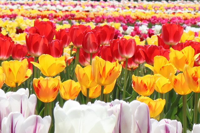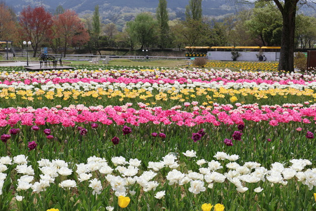 | 滋賀県日野町のブルーメの丘では、12万本40品種のチューリップが見頃を迎えています。 |