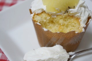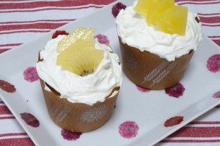 シンプルな材料で作ったマフィンに、ホイップクリームを塗ってゴールドキウイとパインでデコレーション。
